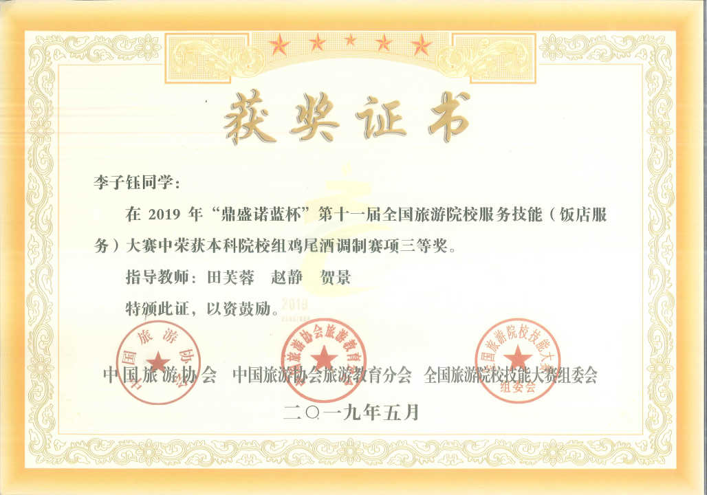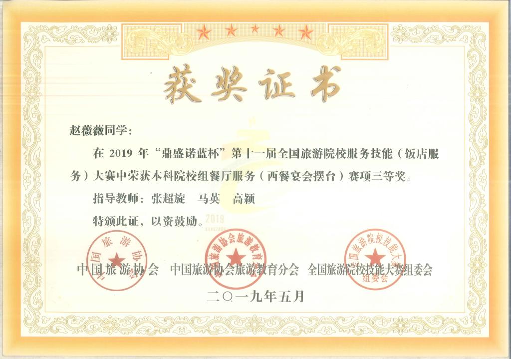 5月16日-19日, 2019年“鼎盛诺蓝杯”第十一届全国旅游院校服务技能(饭店服务)大赛在杭州举办,bevictor伟德陈渟渟、李子钰、章粤东、赵薇薇四名参赛选手均荣获本科院校组三等奖。陈渟渟同学荣获客房服务赛项三等奖,李子钰同学荣获鸡尾酒调制赛项三等奖,章粤东同学荣获餐厅服务(中餐宴会摆台)赛项三等奖,赵薇薇同学荣获餐厅服务(西餐宴会摆台)赛项三等奖。