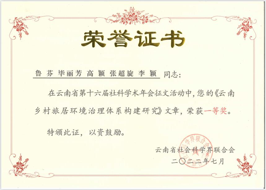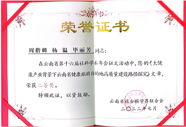 bevictor伟德两名博士带领的研究团队在此次年会中获得了优秀论文一等奖和二等奖,他们分别是鲁芬博士乡村旅居研究团队的论文《云南乡村旅居环境治理体系构建研究》、周楷麟博士健康旅游研究团队的论文《大健康产业背景下云南省健康旅游目的地高质量建设路径探究》。鲁芬博士受邀出席年会现场和领奖仪式。