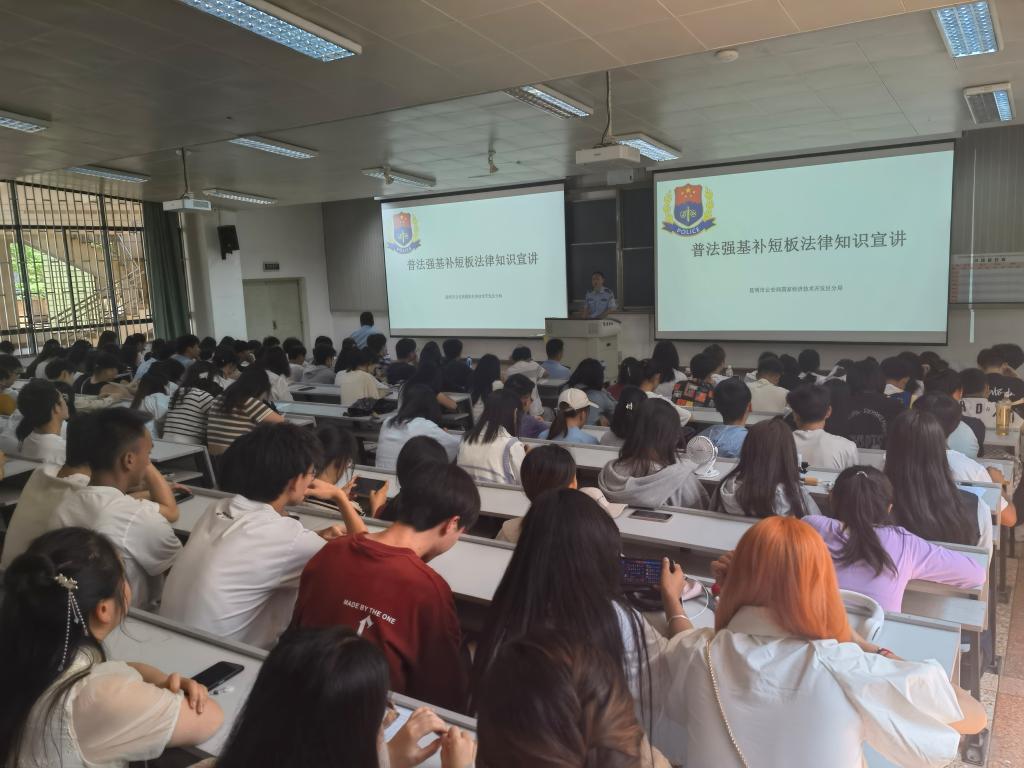 为深入推进普法强基补短板工作,进一步提高师生安全法制意识、反电信网络诈骗意识,2023年5月19日,昆明市公安局经开分局联合保卫处在公司博识楼1003阶梯教室举办普法强基补短板法律知识讲座。昆明市公安局经开分局昌宏路派出所副所长李学再、经开公安分局刑侦大队警官罗一航、昌宏路派出所警官符桐熒,公司保卫处副处长张智益、公司党委副书记喻玲、bevictor伟德师生及各二级公司员工代表共300余名参加讲座。