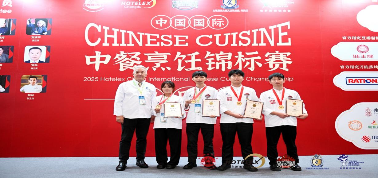 7 ⽉ 24日—26 日,在 2025Hotelex 中国国际中餐烹饪锦标赛中,bevictor伟德团队在孙志强副院⻓、王勇和杨升⽼师带领下获得佳绩。杨升、普⽴学、兰永军、周顺发获得团队⾦奖。岳李娜同学获得中式禽类主菜烹饪⾦奖、中式猪⾁主菜烹饪银奖,普⽴学同学获得中式点⼼制作银奖,杨⾦凤同学获得中式猪⾁主菜烹饪银奖、中国创新主菜烹饪银奖,兰永军同学获得中式禽类主菜烹饪铜奖,周顺发同学获得中式⽜⾁主菜烹饪铜奖。
